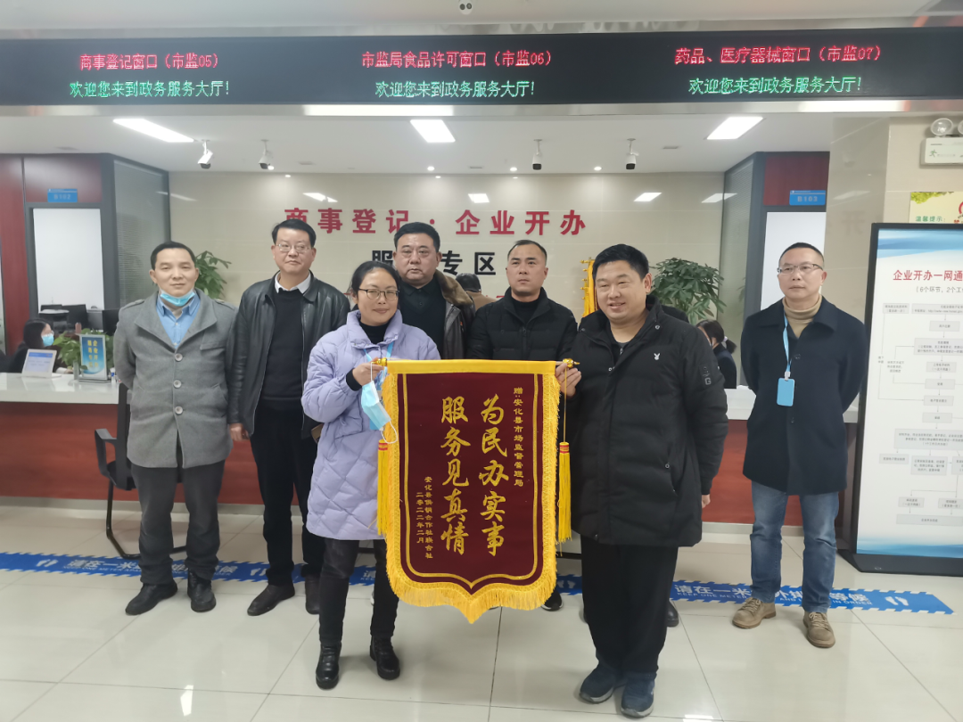 “经常在休息的时间为我们加班工作,你们的敬业、认真、高效的工作态度,让我们很是感动,值得我们学习!”2月16日,安化县供销联社向安化县政务中心市监局窗口送来一面写有“为民办实事,服务见真情”的锦旗,对窗口工作人员高效、贴心的服务表示感谢。据了解,2021年县供销联社因供销综合改革工作需要,需注册登记12家乡镇供销社及25家村级供销服务社。由于供销社登记注册是新事物,市监局接到工作任务后,耐心细致的为登记注册寻找政策支持,解决注册难题,提供工作方便。由于乡镇及村社区来县城办事不方便,市监局窗口工作人员经常加班加点一次性完成注册登记全部工作。为感谢窗口工作人员热情、高效的服务,县供销联社主要负责人带领班子成员赴安化县政务中心市监局窗口赠送锦旗。