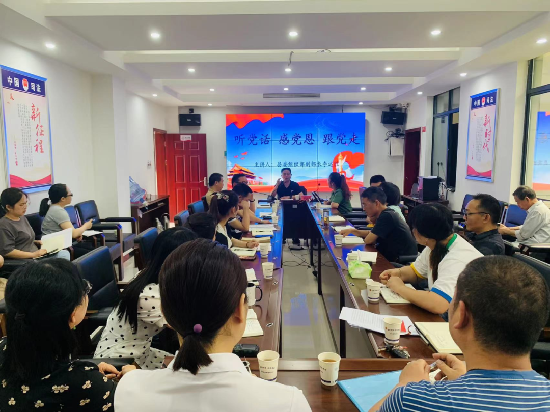 6月17日上午,县委组织部副部长、县委两新工委书记李远胜以《听党话 感党恩 跟党走》为主题,在县司法局讲授专题党课,机关支部全体党员、入党积极分子、离退休人员支部书记、律师支部书记共30余人参加学习。