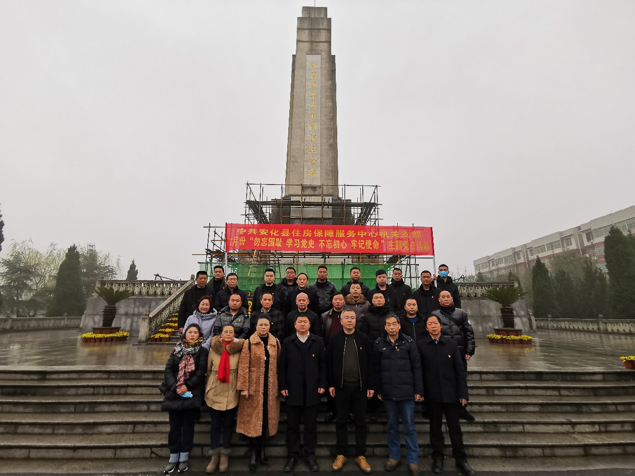 2月28日,安化县住房保障服务中心组织30余名党员、离退休支部代表赴益阳南县“厂窖惨案”纪念馆开展二月份“勿忘国耻、学习党史;不忘初心、牢记使命”主题党日活动。 党员们在纪念碑前向遇难同胞敬献了花篮,面对党旗,大家高举右手,重温入党誓词;随后集体参观了纪念馆,观看纪念片《幸存者说》,通过讲解员介绍,身临其境地感受那段侵华日军残忍血腥、全国人民共赴国难的艰难历史。党员们还集中观看了《奉献》《湘南农民运动先驱雷晋乾》等红色微视频,最后中心党组书记给全体人员讲述了一堂微党课。 活动让全体人员接受了一次深刻的爱国主义教育和党性的洗礼。大家纷纷表示,要做到勿忘国耻、警钟长鸣,不忘初心、牢记使命,积极投身县域住房保障事业伟大实践,争做“维护核心、听党指挥”的新时代住保人,以优异的成绩为庆祝建党100周年献礼! |