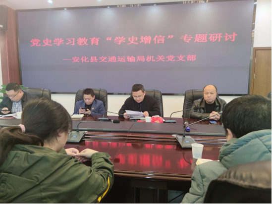 在红色安化陈列馆,全体人员走过“红色火种、星火燎原、抗日烽火、安化解放”四段安化历史,对党的安化发展史有了更全面地认识,对革命先辈有了更深厚的敬意。 党员邓长军表示,“从小听父辈们讲述湖南坡战斗的故事,以及那里埋葬的革命英烈,今天历览战斗档案,让我仿佛亲身经历了当时战火纷飞的场面……让我更加坚信革命先辈值得缅怀尊敬、革命成果来之不易。” 在交通运输局七楼会议室,召开了党史学习教育“学史增信”理论学习研讨会。观看了党史红色视频《一块老弹片的述说》《生活的支点》《第一讲:中国共产党为什么“能”》,重温了入党誓词和党章,学习了习近平总书记在党史学习教育动员大会上的讲话、新冠病毒疫苗接种工作电视电话会议有关精神。 最后,党员们结合今天的活动和工作实际,就“学史增信”展开深刻研讨。党员周喜晴表示“通过此次活动,革命前辈姚炳南、向轩等人事迹对我感触很深,他们怀着‘红色信念’,撒下红色的种子,为革命赴汤蹈火……历史告诉我,中国共产党的领导是历史的选择、人民的选择,作为一名党员我很自豪。”