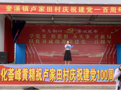6月18日,奎溪镇卢家田村举办庆祝建党一百周年文艺汇演活动,邀请奎溪镇党政领导、各办中心负责人、各党组织负责人、市县派出乡村振兴工作队队长观看演出。 奎溪镇党委委员、组织委员指出,今年是“十四五”规划开局之年,也是巩固拓展脱贫攻坚续接乡村振兴的奋斗之年,在中国共产党一百岁华诞即将到来之际,卢家田村组织盛会用文艺汇演的方式来颂扬伟大的党、颂扬日益繁荣昌盛的祖国。下一步,全镇上下将同心同力同向行、共战共进共担当,投身到加快建设家乡发展的伟大实践中,努力开创奎溪乡村振兴的新篇章。 ![]() 活动节目内容形式丰富、内容新颖,包括唱歌、小品、歌舞、阳戏等节目12个,还在其中穿插了党史知识抢答环节。演出在集体舞《没有共产党就没有新中国》中隆重拉开帷幕,一个个节目深情回顾了老一辈共产党人的峥嵘岁月,表达了在习近平新时代中国特色社会主义思想的指引下,坚定信心,永远跟党走,结尾全体演员和观众合唱一曲《没有共产党就没有新中国》,最终升华主题,表达了对党、对祖国热忱的爱。