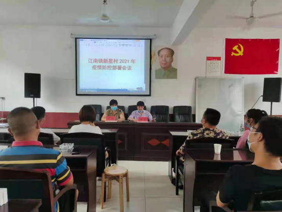 快速决策,同心抗疫。8月3日上午7时30分,村党支部书记、村主任陈姚组织村支两委成员召开抗疫斗争专题会议,会议由江南镇政府驻新星村工作队第一书记陈勇主持。会上,成立了以第一书记任顾问,支部书记、村主任任组长,村支两委成员任成员的新星村新冠病毒防控防治领导小组,领导小组下设办公室,并明确了办公室主任。会议同时决定,组织共产党员、村民组长、村义务志愿者参与防疫一线战斗;组织党员志愿者服务队,在村入口处设立“三码”(健康码、行程码、新冠疫苗接种记录)检查点,对进入本村人员登记检查并测量体温;号召广大村民积极支持配合,同心抗疫,共筑疫情防控防治坚实屏障。