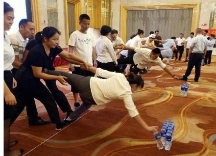 第二个项目群龙取水:握紧手,拉住脚,选手们纷纷做出高难度动作, 快速向前拿起水瓶!